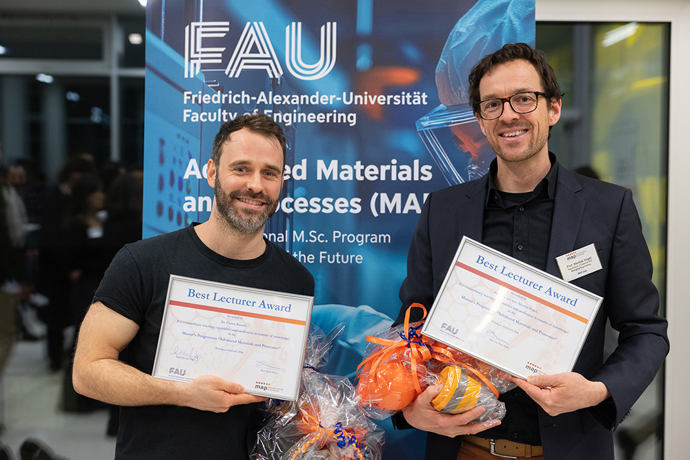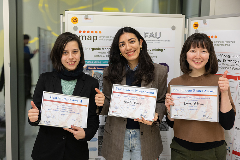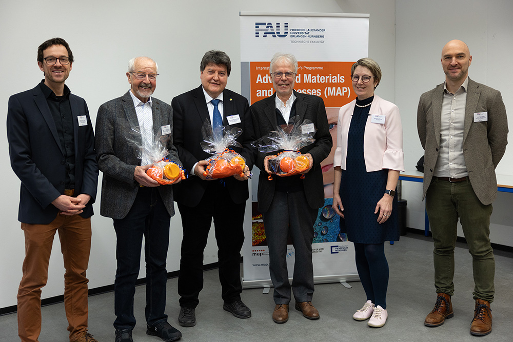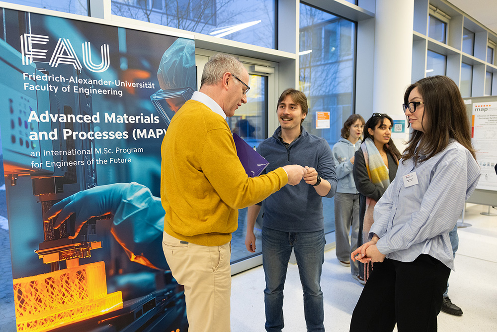On February 4, 2026, the degree program celebrated its 20th anniversary. The event included a symposium with presentations by various professors involved in the MAP program, covering the program’s historical foundation and initial steps (Prof. Müller, initiator of the MAP program), its current development (Prof. Felfer and Prof. Vogel, MAP Chairs), the significance of the program for the development of FAU (Prof. Peukert, long-standing lecturer in MAP), and the broader importance of international research and the exchange of scientific ideas for both host and guest countries (Prof. Boccaccini). The event concluded with the annual poster session, where MAP students from their third semester presented their mini-projects as part of the celebration.