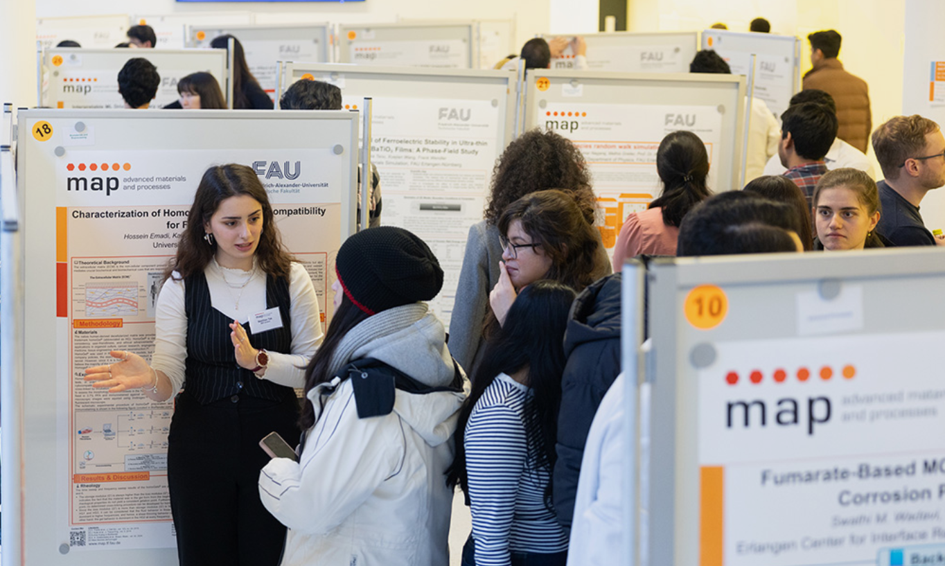 On February 4, 2026, the degree program celebrated its 20th anniversary. The event included a symposium with presentations by various professors involved in the MAP program, covering the program’s historical foundation and initial steps (Prof. Müller, initiator of the MAP program), its current development (Prof. Felfer and Prof. Vogel, MAP Chairs), the significance of the program for the development of FAU (Prof. Peukert, long-standing lecturer in MAP), and the broader importance of international research and the exchange of scientific ideas for both host and guest countries (Prof. Boccaccini). The event concluded with the annual poster session, where MAP students from their third semester presented their mini-projects as part of the celebration.